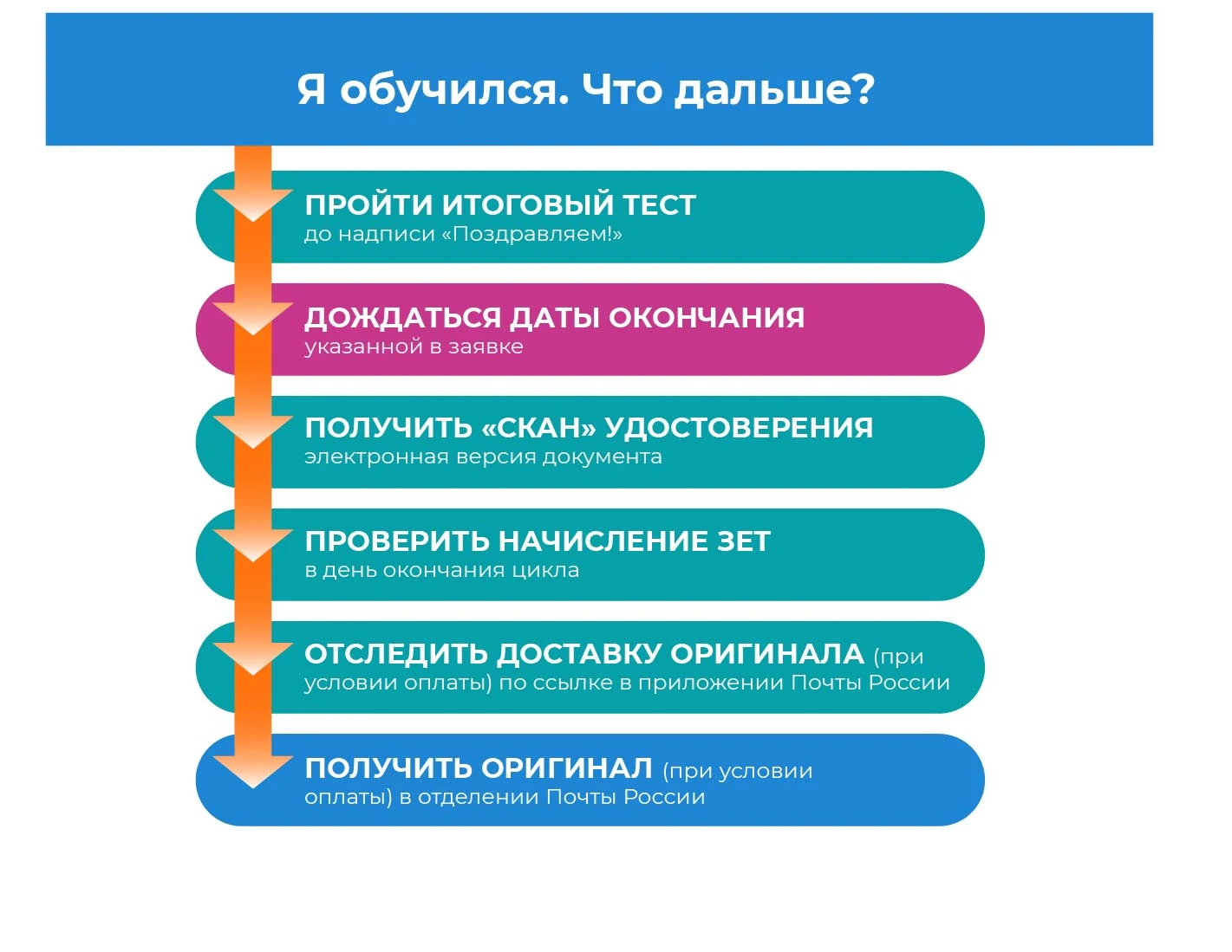 7. Если Вы сдали итоговое тестирование успешно, в день окончания цикла обучения, указанный в заявке, Вам на электронную почту придет электронное удостоверение и будут начислены ЗЕТ (может занять до 24 часов).