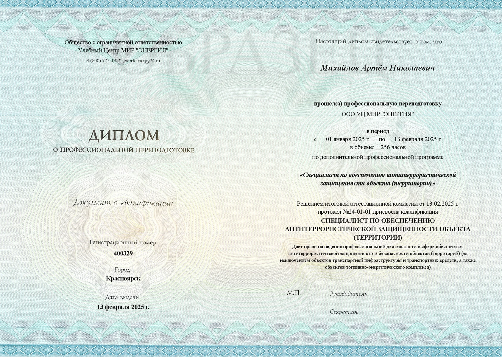 ![]() | Диплом о профессиональной переподготовке Документ выдается тем, кто успешно освоил программу профессиональной переподготовки "Специалист по обеспечению антитеррористической защищенности объекта (территории)". Данный документ дает право на ведение профессиональной (присваивает требуемую квалификацию для ведения профессиональной деятельности). | Однократное получение |